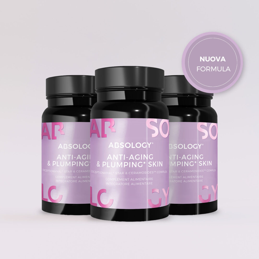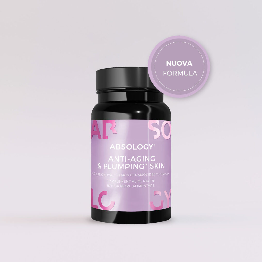 ABSOLOGY® Anti-aging & Plumping Skin è la nuova formula che, grazie alla combinazione di esclusivi principi attivi brevettati, ceramidi vegetali e acido ialuronico (CeramosidesTM e ExceptionHYAL® Star) aiuta a rimpolpare, nutrire e idratare la pelle stimolandone la produzione interna di molecole strutturali.